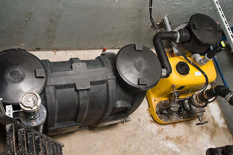 Der Fettabscheider reinigt das Abwasser des Küchenbetriebs und wird manuell entsorgt. Der Topf über der compli dient der Probenentnahme