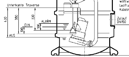 Die zweite Glocke sollte etwa 10 cm über der ersten hängen und hat den blauen Schlauch dran. Damit wird der Alarmschaltpunkt aufgenommen, d.h. wenn die Glocke einstaut und der zugehörige Druckschalter schaltet, ertönt Alarm und die Pumpe erhält auch nochmal einen Einschaltbefehl. (Erhöhte Betriebssicherheit durch Redundanz). Die genauen Angaben zum PKS. Schacht findest du in anhängender Skizze und in der Betriebsanleitung (die du idealerwesie noch findest).