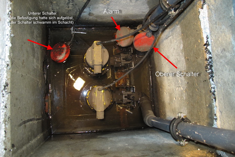 Hier ein Foto vom Schacht. Ich hatte vergessen zu erwähnen, dass sich die Rohrschelle des unteren Schalters aufglöst hat und der Schalter frei im Schacht schwamm. Ich habe dies nicht so dramatisch gesehen, weil es noch den Alarm und den oberen Schalter gibt. Habe den Schalter provisorisch mit einem Schlauchbinder befestigt.