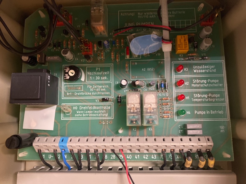 Die Verbindungen zu den Druckschaltern (weißer und blauer Schlauch) habe ich bei entleertem Pumpenschacht (Pumpe zieht Luft) schon mal getrennt und neu verbunden.